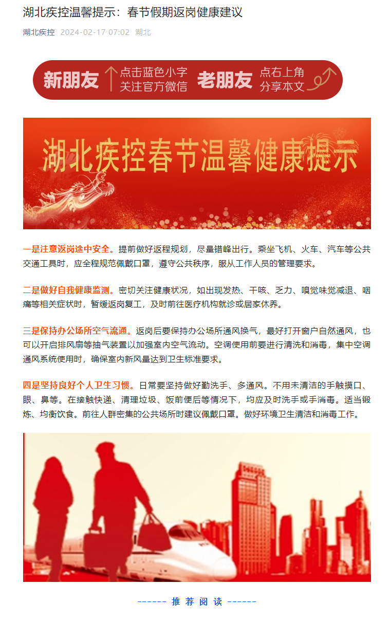 湖北疾控溫馨提示:春節(jié)假期返崗健康建議