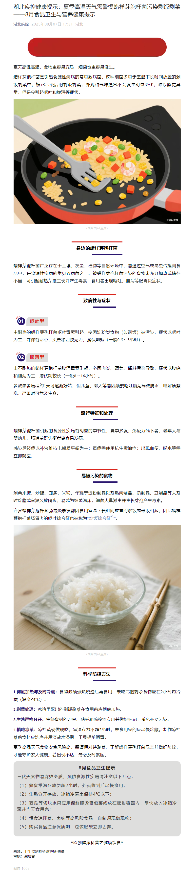 湖北疾控健康提示:夏季高溫天氣需警惕蠟樣芽胞桿菌污染剩飯剩菜——8月食品衛(wèi)生與營養(yǎng)健康提示