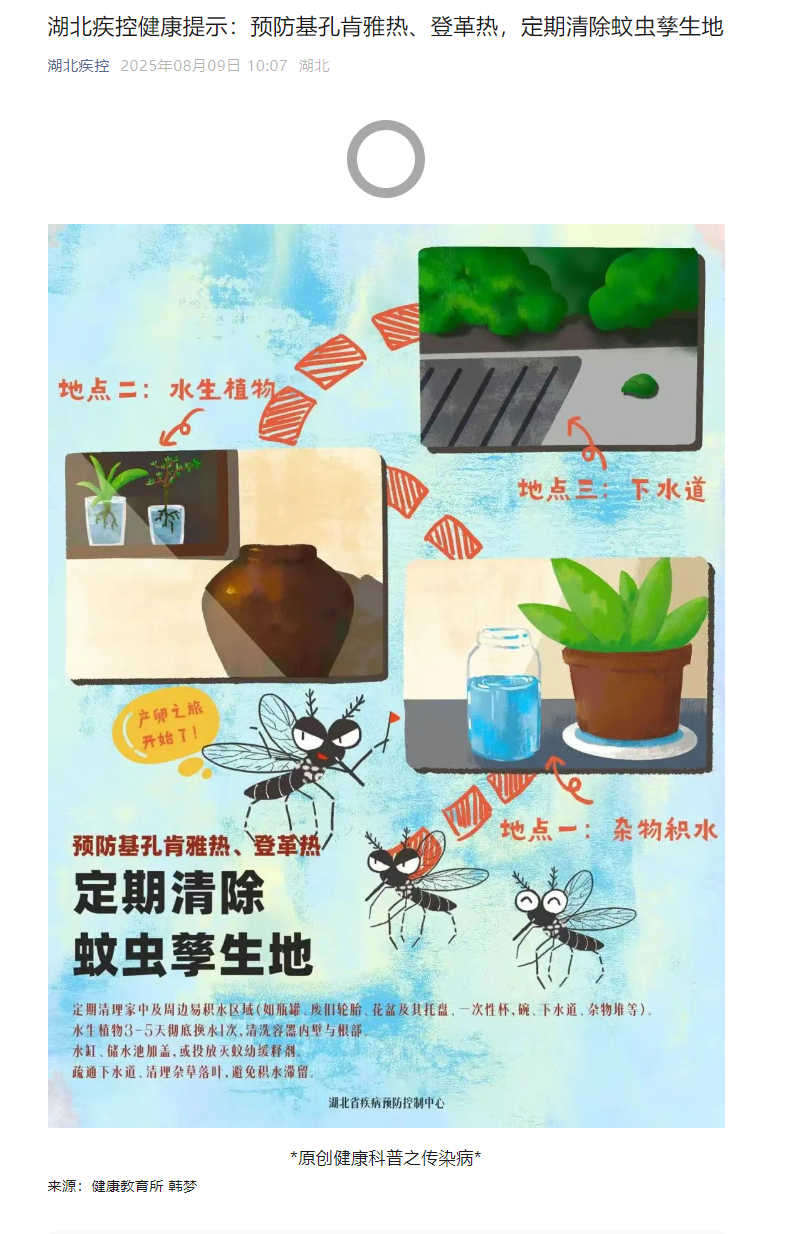 湖北疾控健康提示:預防基孔肯雅熱、登革熱,定期清除蚊蟲孳生地