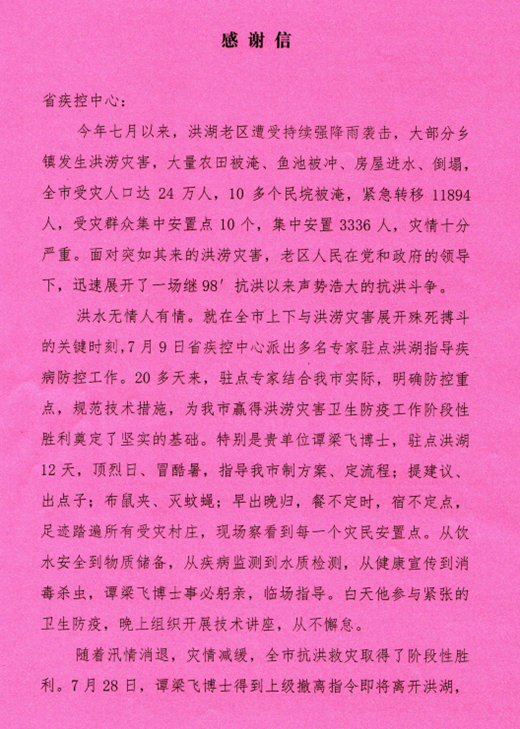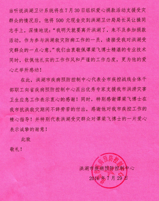 洪湖市疾控中心感謝信