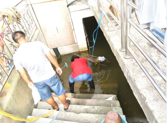 針對還有少部分居民地下室及廁所仍未退水,水質水污染嚴重問題,專業人員因地施策,現場采取懸吊加有漂白精片打孔的塑料瓶,通過緩慢釋放消毒劑改善水環境,有效控制蚊蠅孳生環境,控制腸道傳染病及病媒生物傳染病發生。