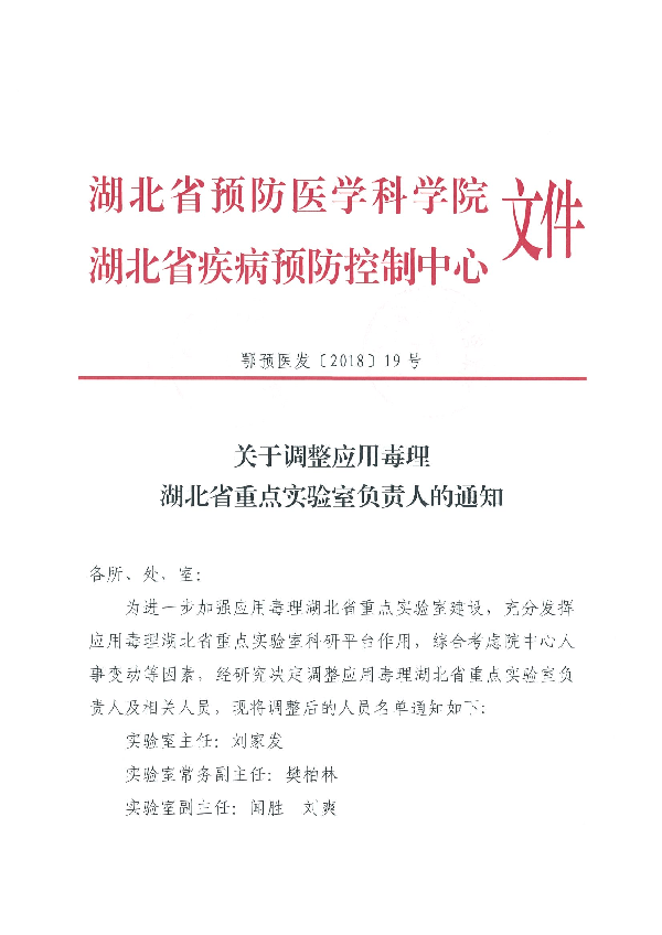 關于調整應用毒理學湖北省重點實驗室負責人的通知